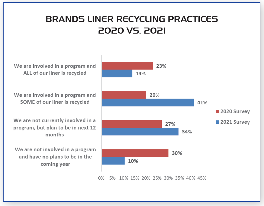 Il rapporto approfondisce anche le dinamiche tra acquirenti e trasformatori rispetto a tempi e standard di consegna, impianti di produzione, etichette alternative e soluzioni di imballaggio, requisiti di sostenibilità ambientale e protocolli di riciclaggio dei liner di rilascio. Di particolare interesse è il fatto che un numero crescente di intervistati è coinvolto in un programma di riciclaggio dei liner. Rispetto a un anno fa, la percentuale di intervistati che dichiarano di essere coinvolti in un programma di questo tipo è più che raddoppiata al 41%, mentre la percentuale che dichiara di non esserlo è scesa dal 30% al 10% . Il 63% ha risposto di essere disposto a rendere disponibile il liner usato per il ritiro negli hub, a condizione che si trovino entro un raggio di 200 km dalla fabbrica.